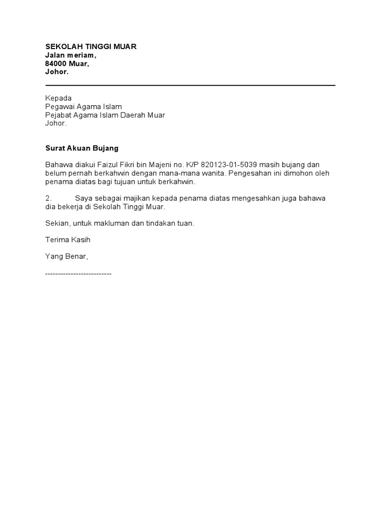 Kalau johor lain kena ikut surat dari ketua kampung dia punya template tuh. Surat akuan bujang adalah salah satu dokumen yang diperlukan bagi pasangan yang ingin mendirikan rumah tangga. 16620106 contoh surat berhenti kerja.